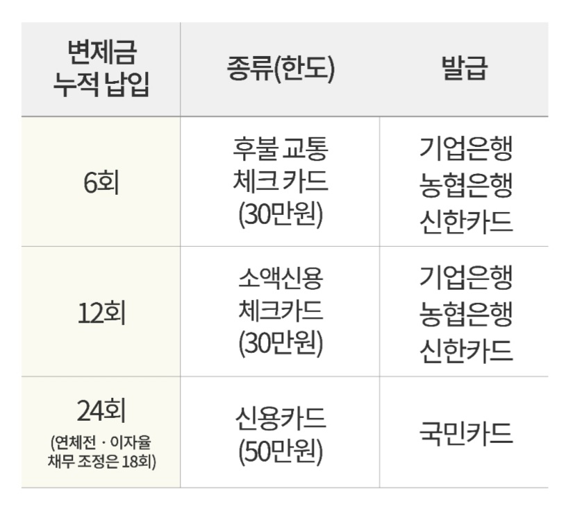 후불 교통카드나 신용카드의 경우는, 개인채무조정을 6개월 이상 성실히 상환하면 발급받을 수 있다.