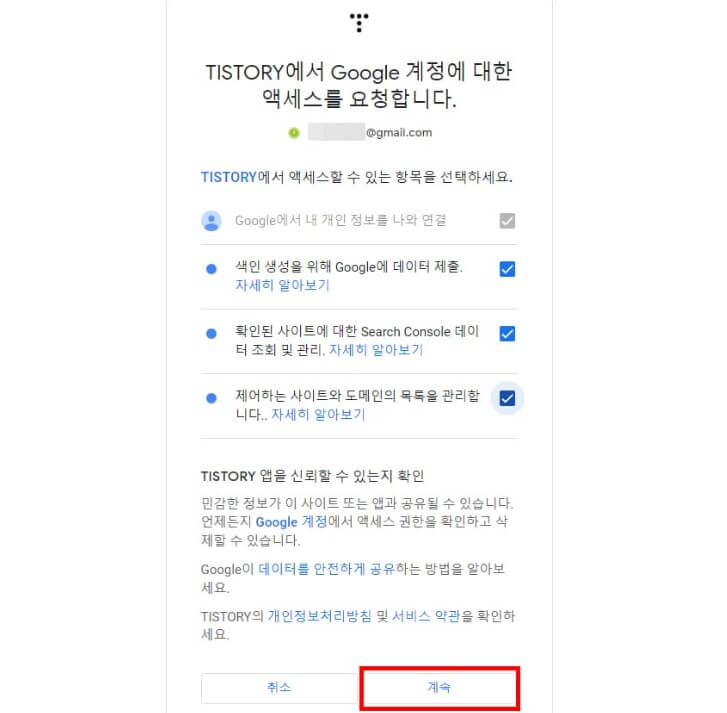 구글 계정에 로그인하고 나서, 액세스 요청에 체크를 하고 계속을 누르면 연결됩니다.