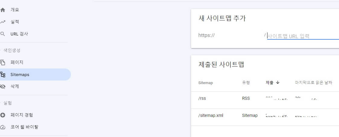 새 사이트 맵 추가 부분에 슬래쉬(/) 다음에 rss 쓰시고 제출 눌러주시고요