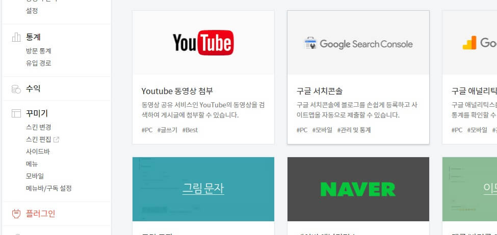 먼저 블로그 관리 화면 왼쪽 메뉴에서 플러그인을 선택합니다