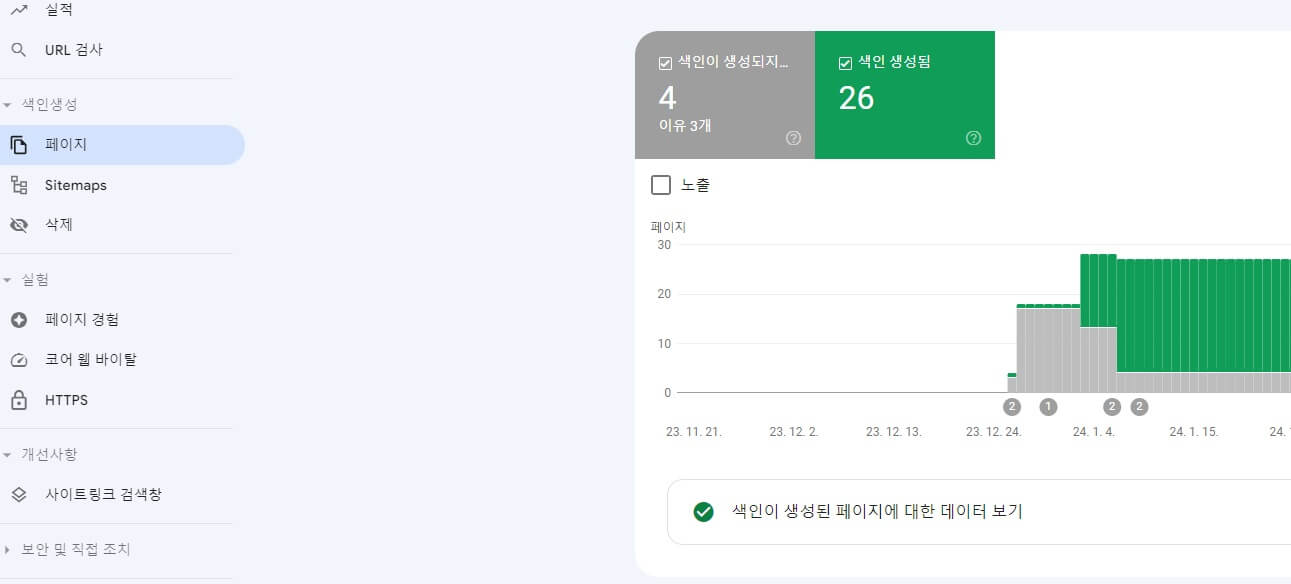 이를 확인하기 위하여 구글 서치 콘솔의 왼쪽 메뉴에서 페이지를 클릭하면, 색인이 생성되지 않은 페이지와 색인이 정상적으로 생성된 페이지 목록을 아래와 같이 확인할 수 있습니다.